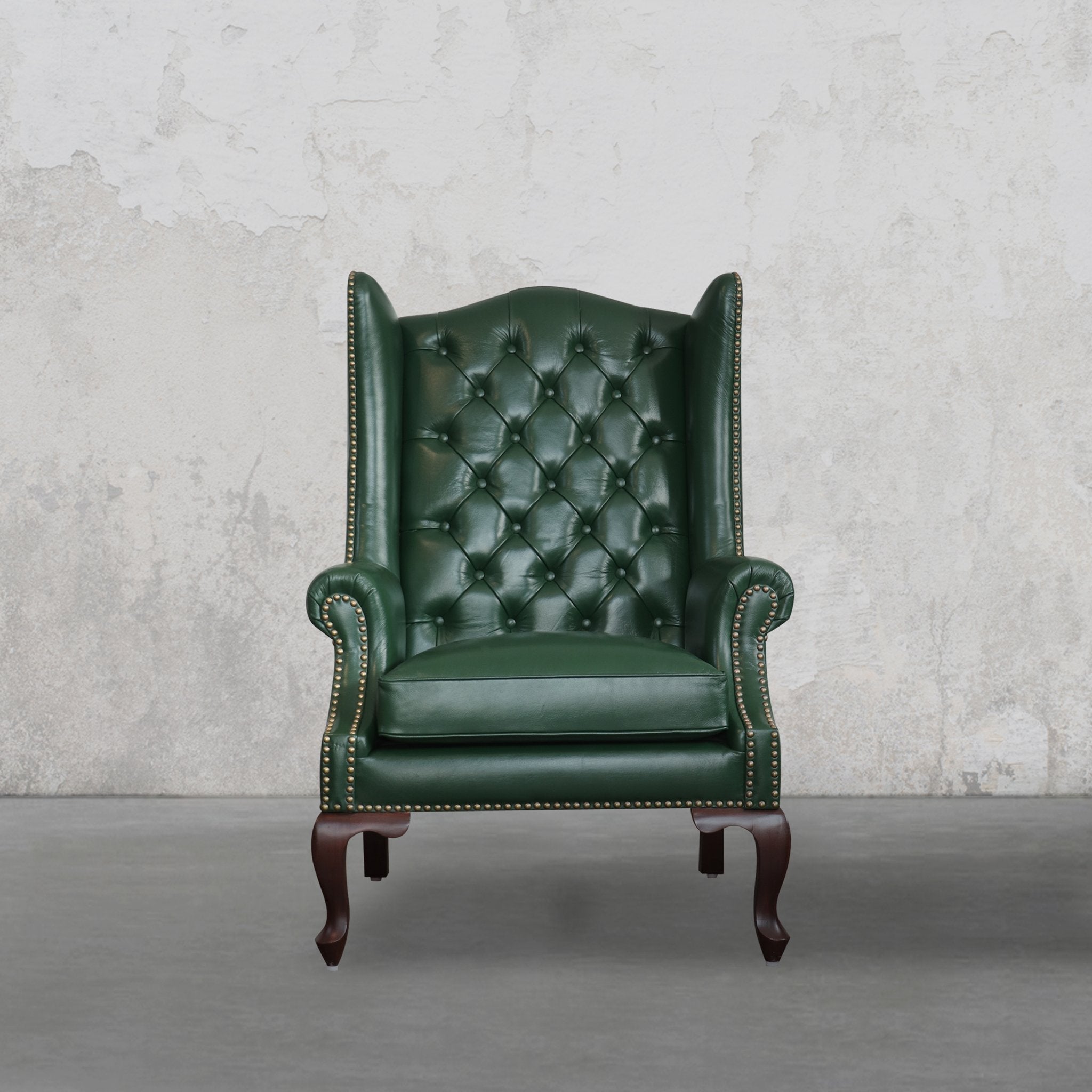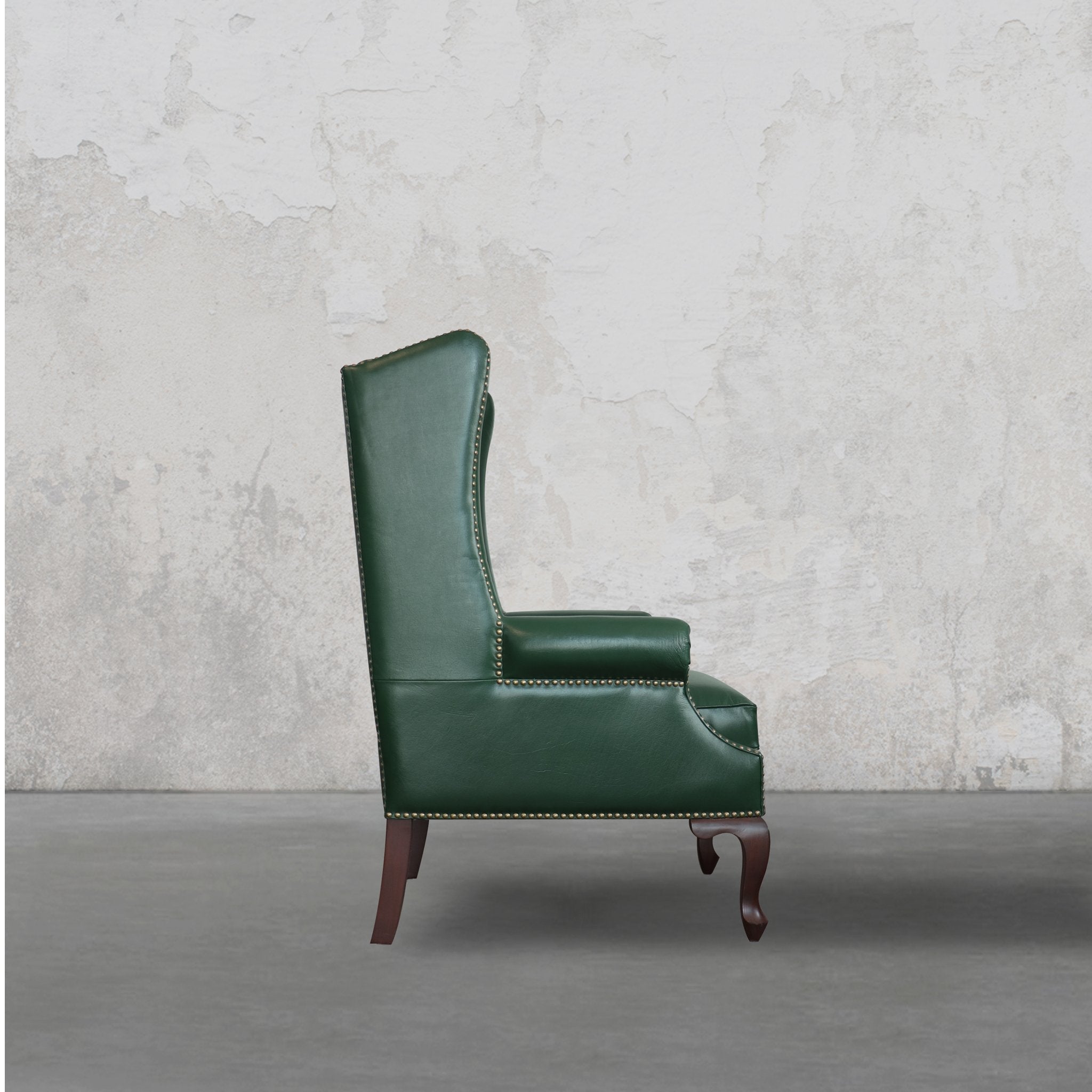 Leather, Kiln dried hardwood solid frame, fine teak legs, high density PU foam, polyfibre and antique brass metal nails