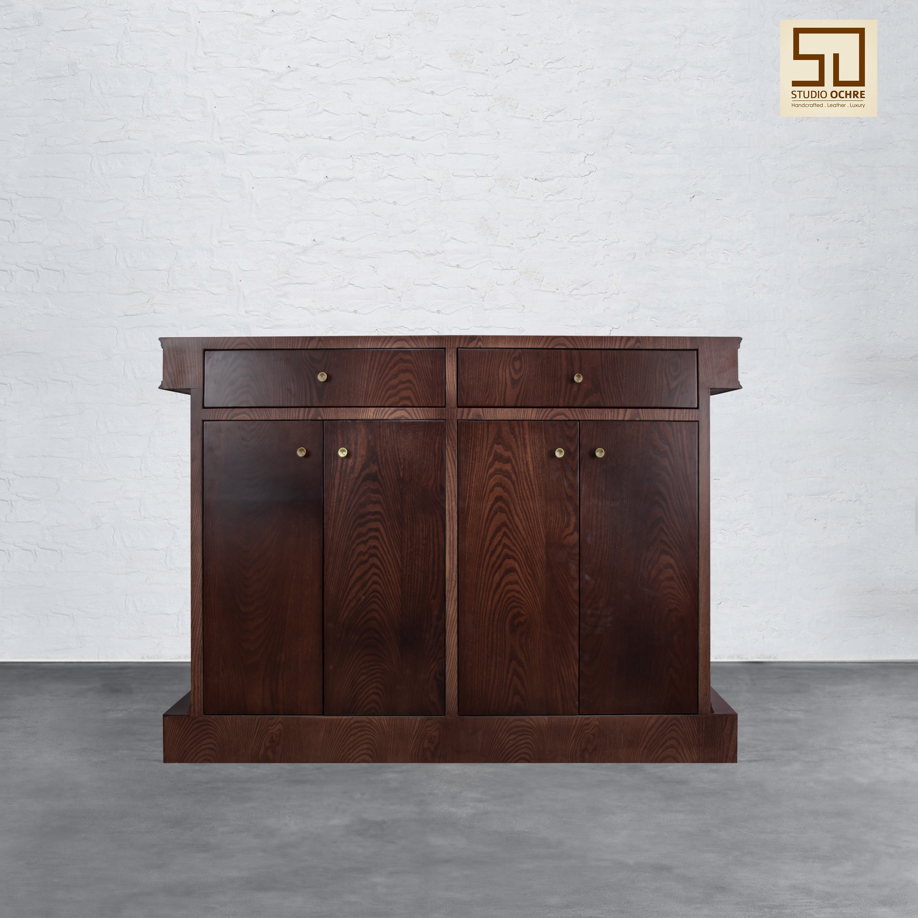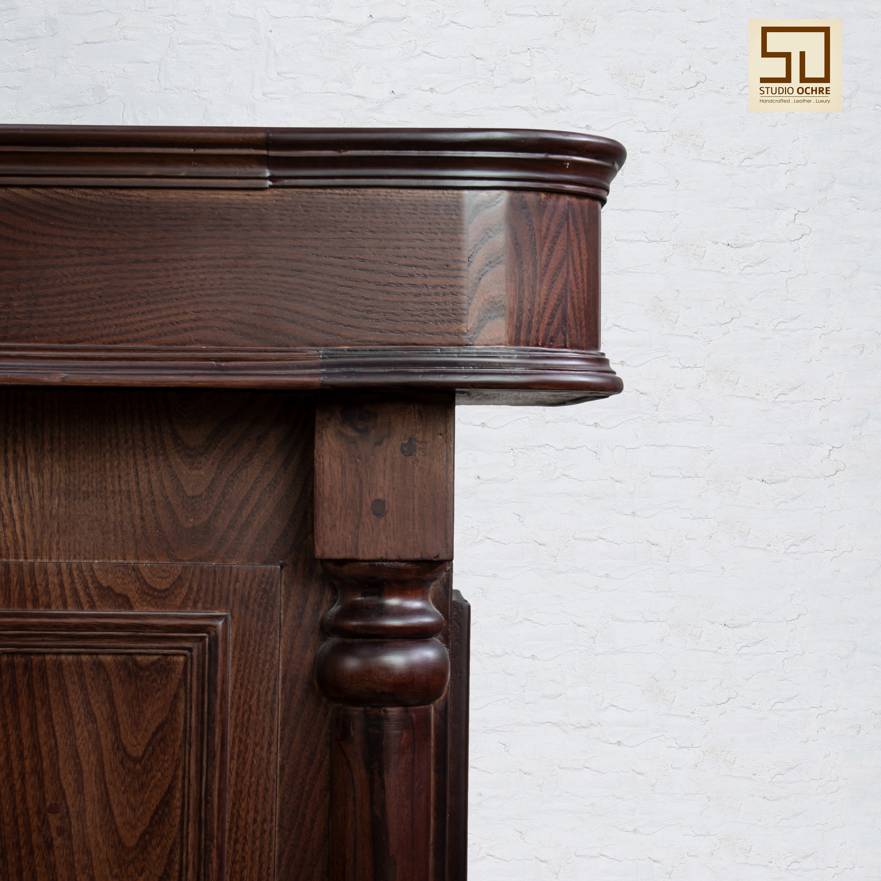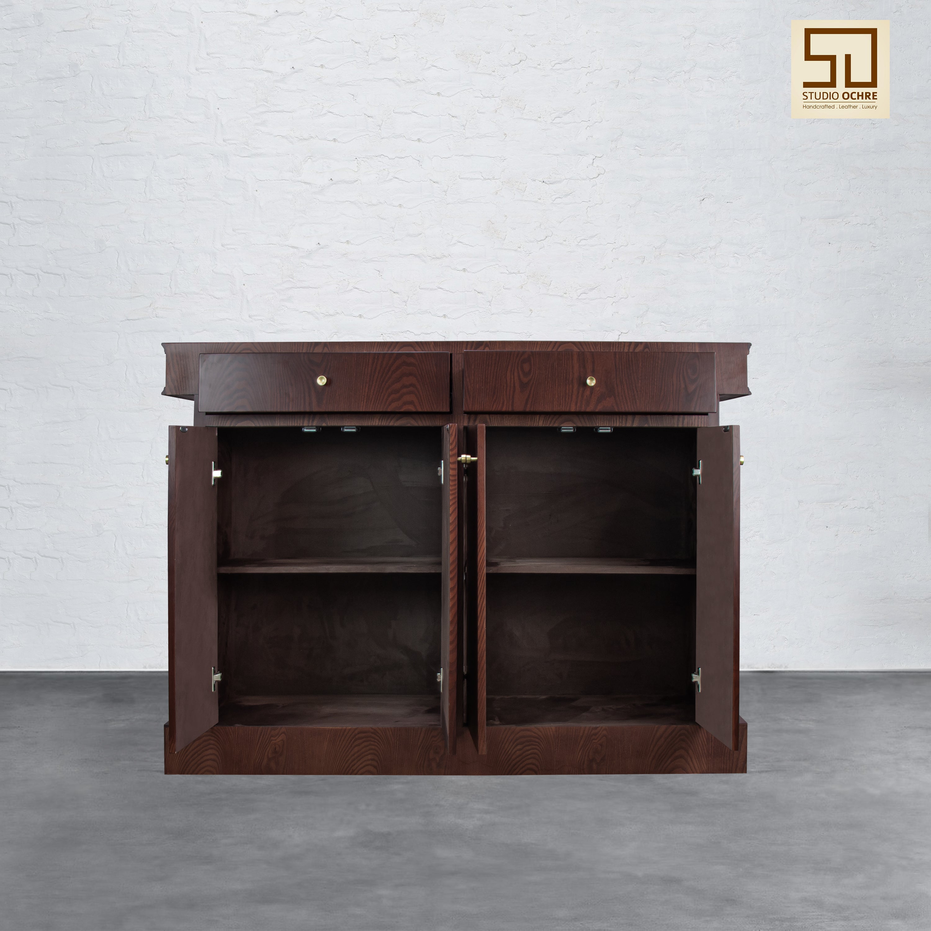 Solid Teak Wood, Fine Veneer, Fine plywood base, Suede fabric & antique brass hardware.