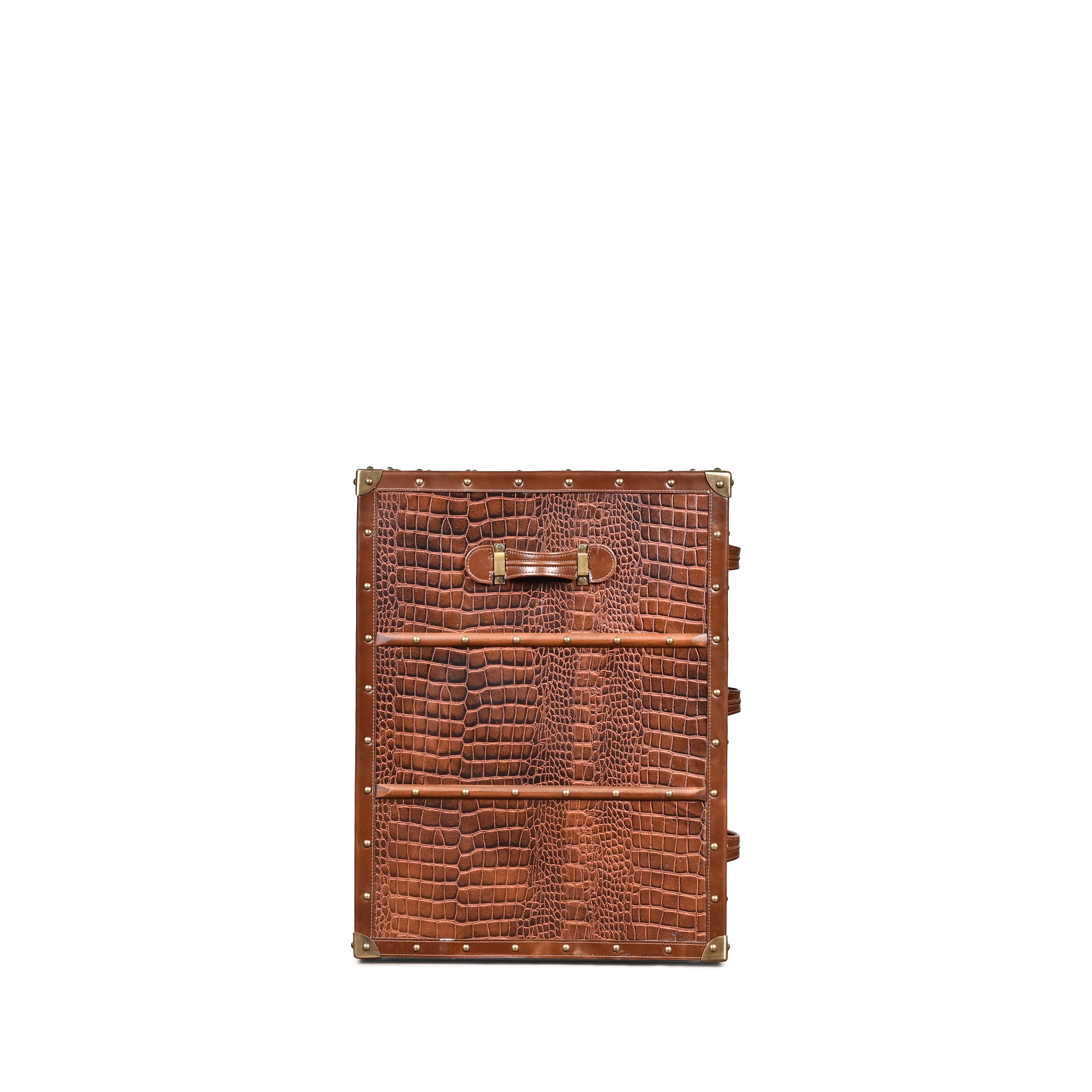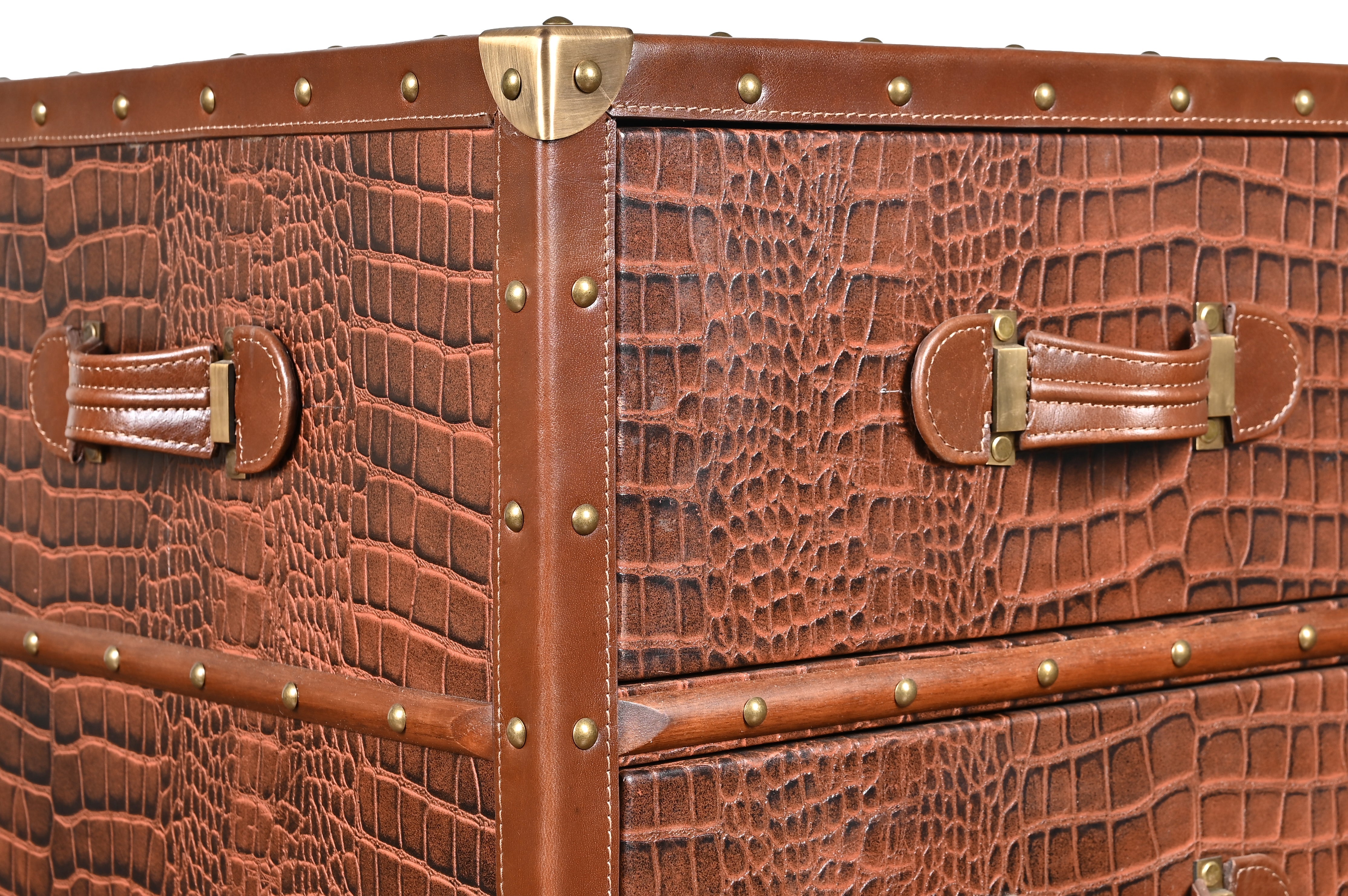 Genuine Leather, Fine wood base, Teak Wooden Strips, suede fabric & antique hardware.