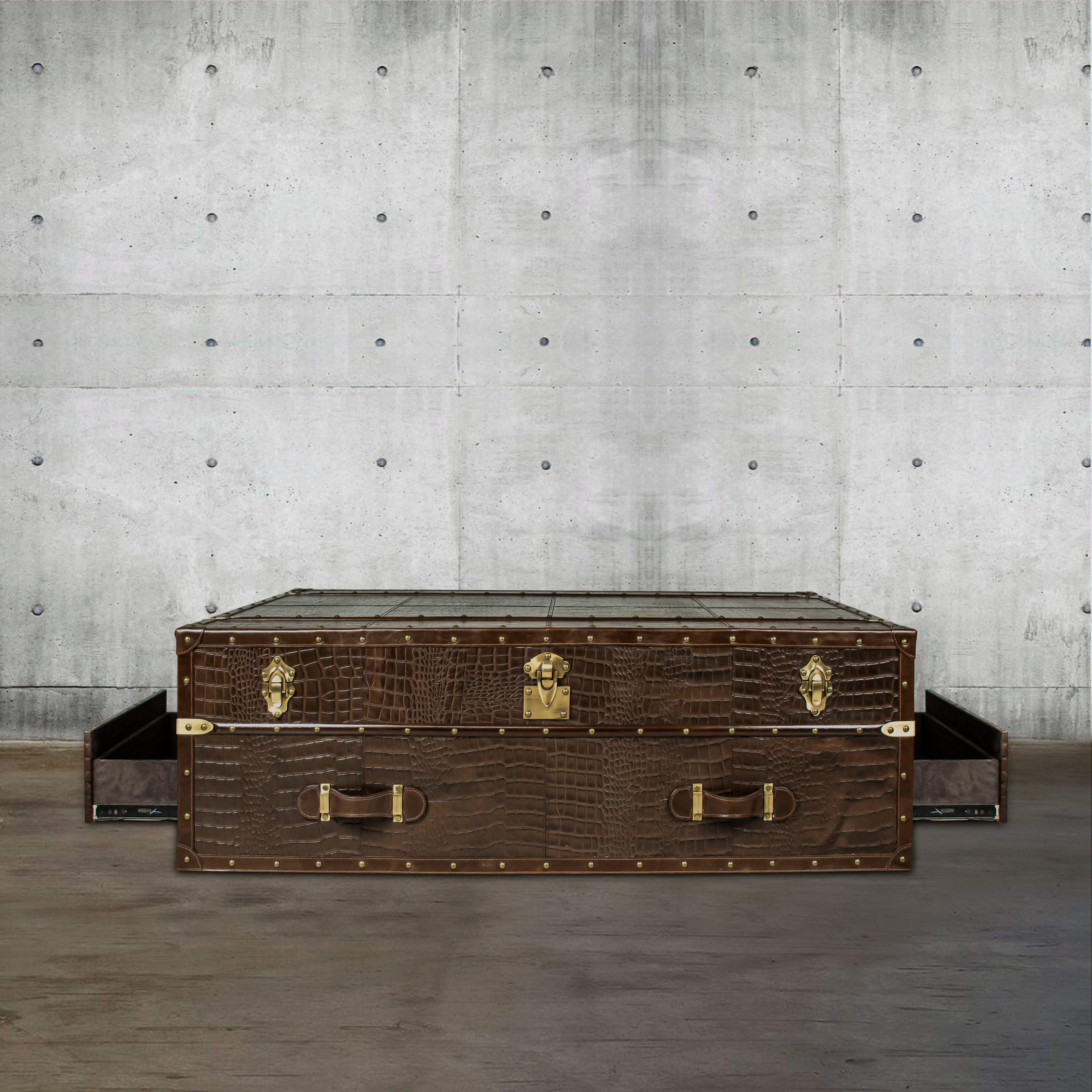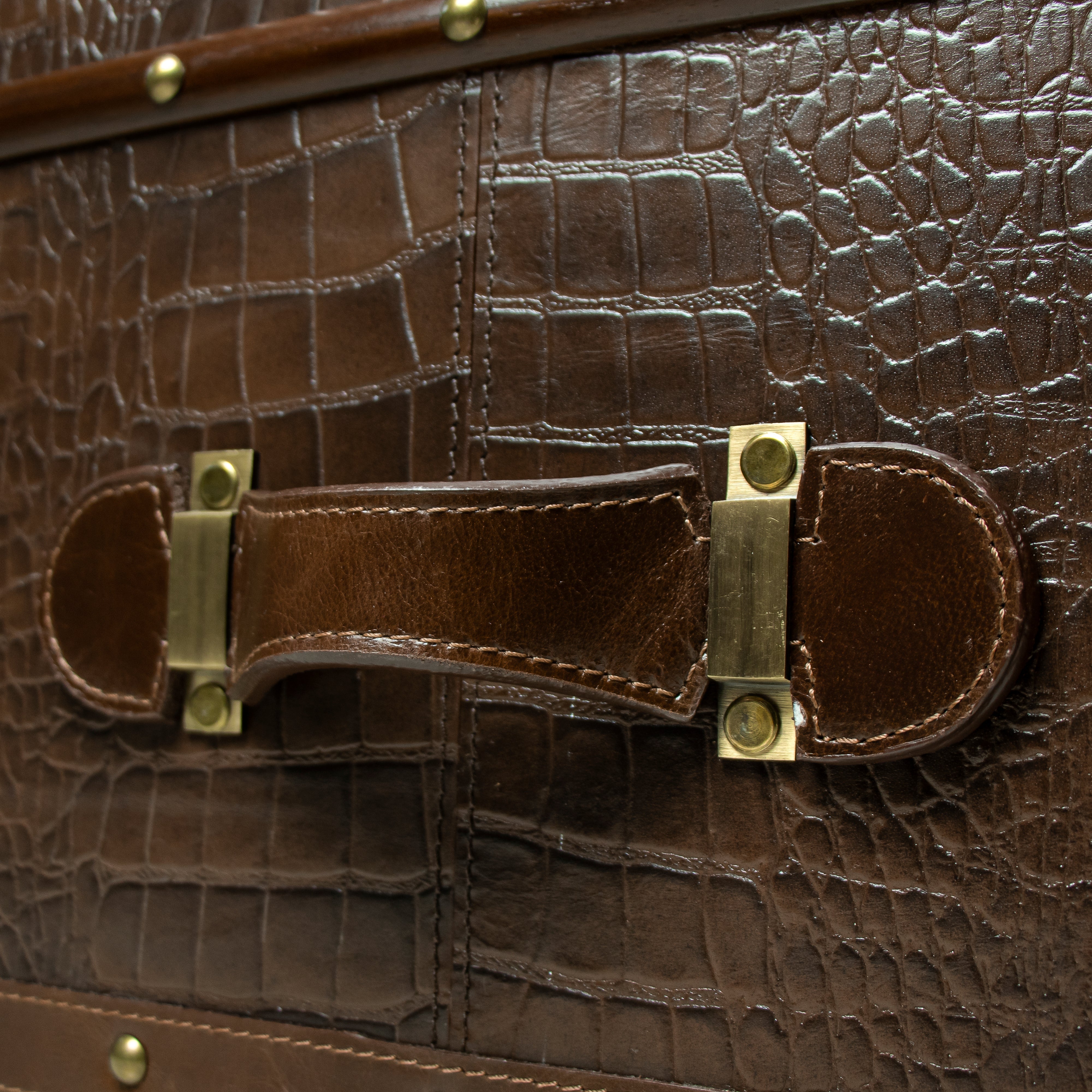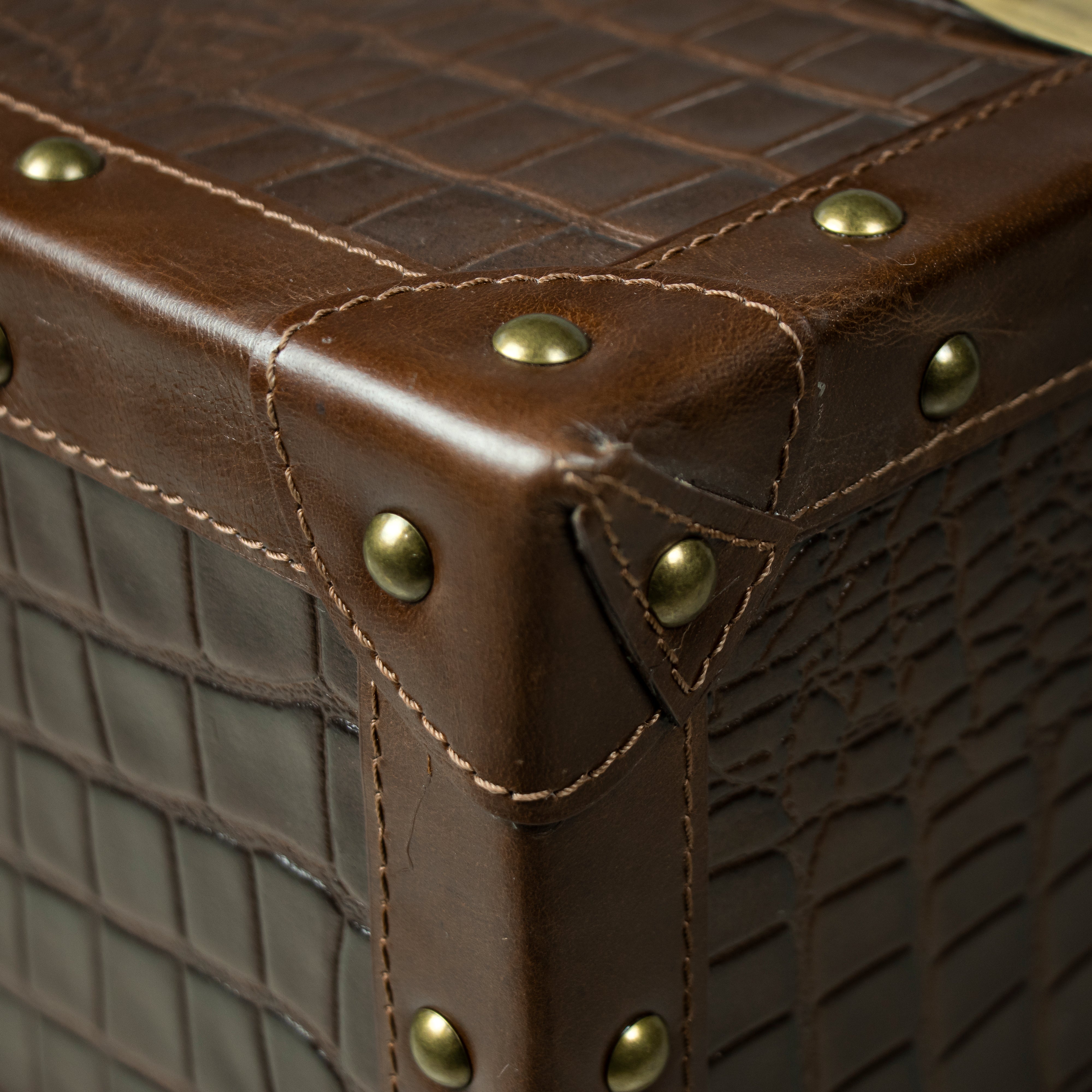 Genuine Leather, Suede Fabric Lining, Water Resistant Plywood Base and Antique Brass Metal Hardware