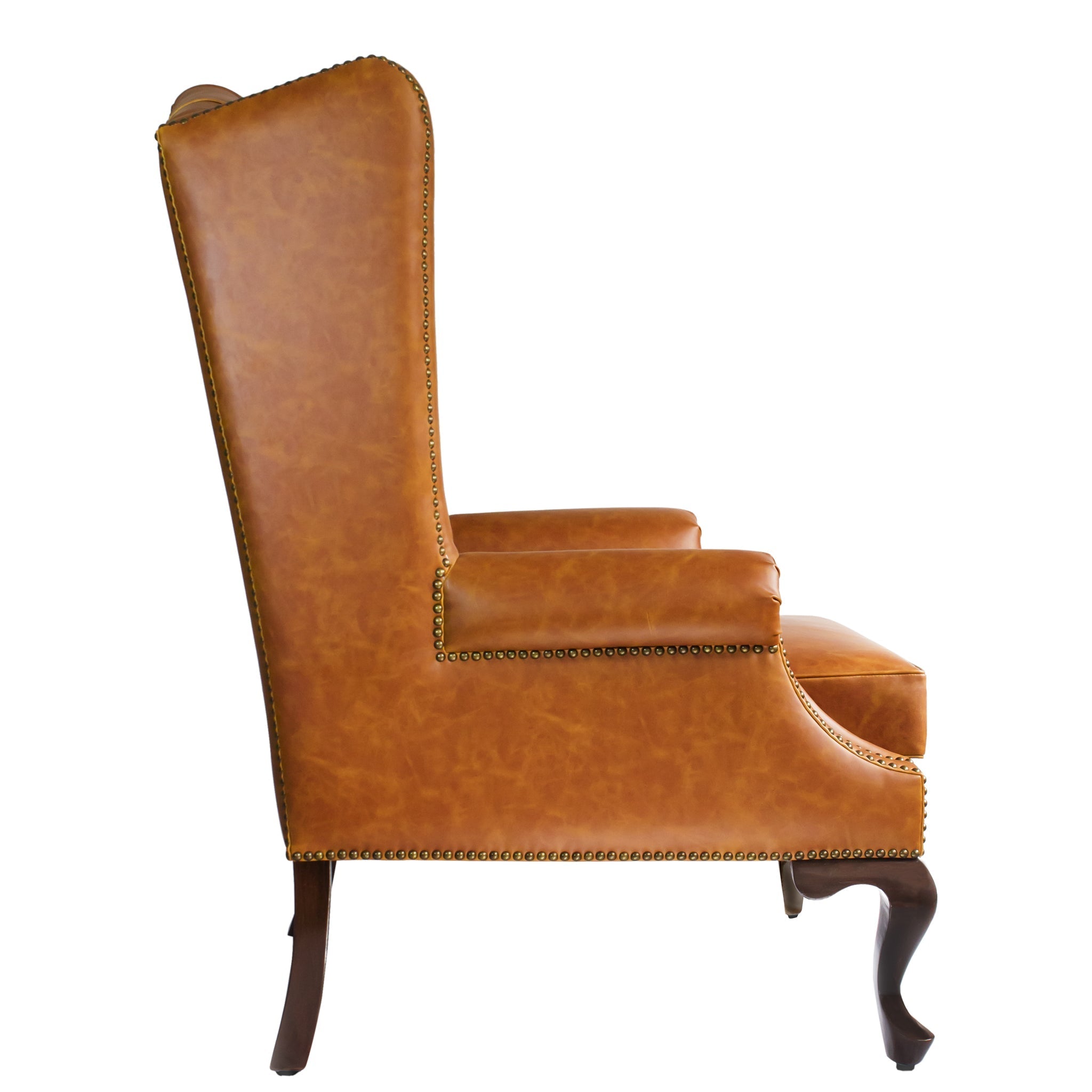 Leather, Kiln-dried hardwood solid frame, fine teak legs, high-density PU foam, poly fiber, and antique brass metal nails