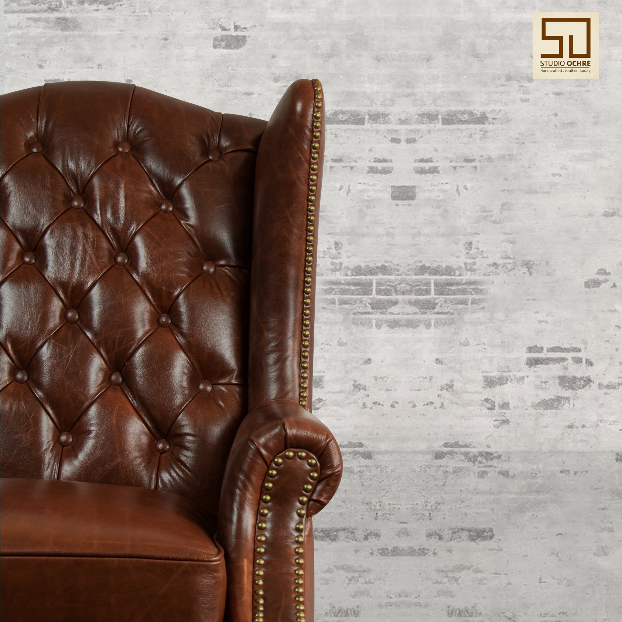 Leather, Kiln-dried hardwood solid frame, fine teak legs, high-density PU foam, poly fibre and antique brass metal nails