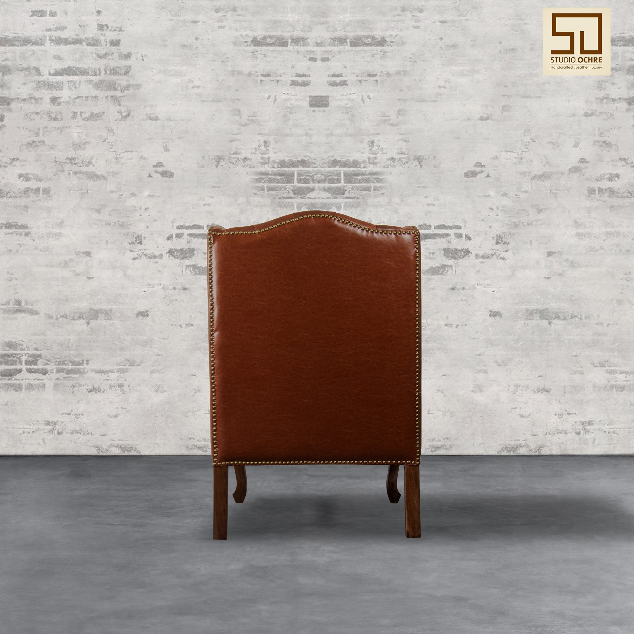 Leather, Kiln dried hardwood solid frame, fine teak legs, high density PU foam, polyfibre and antique brass metal nails
