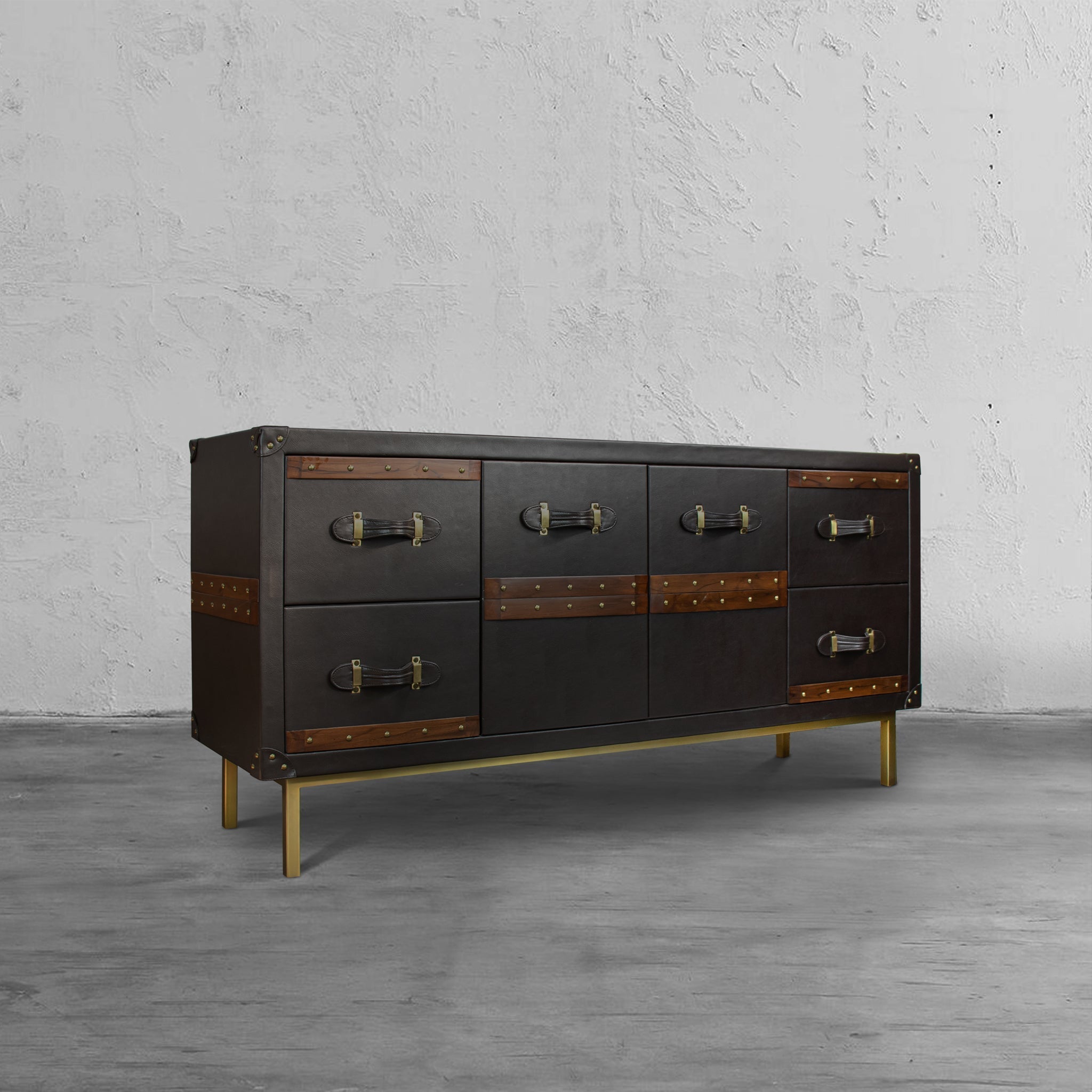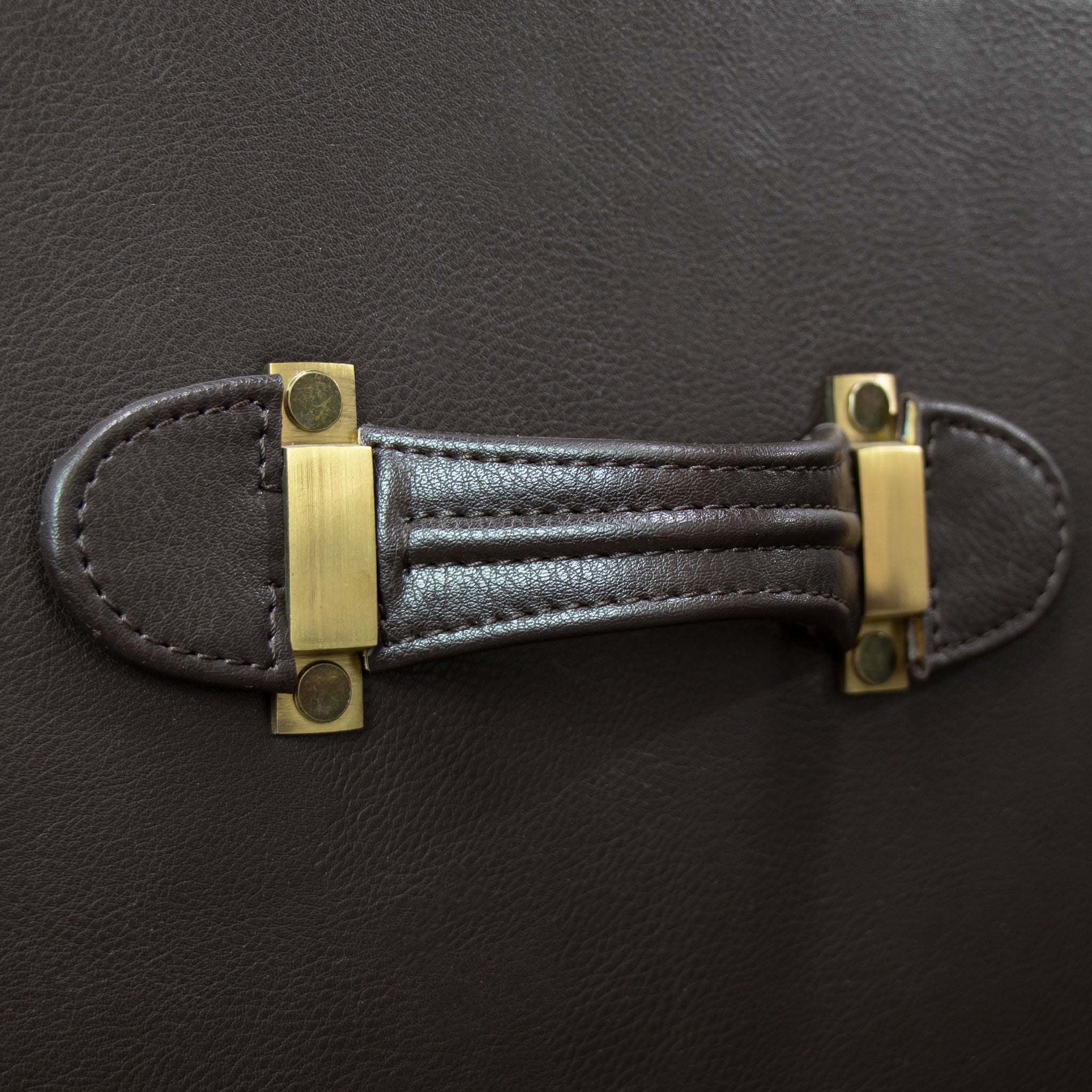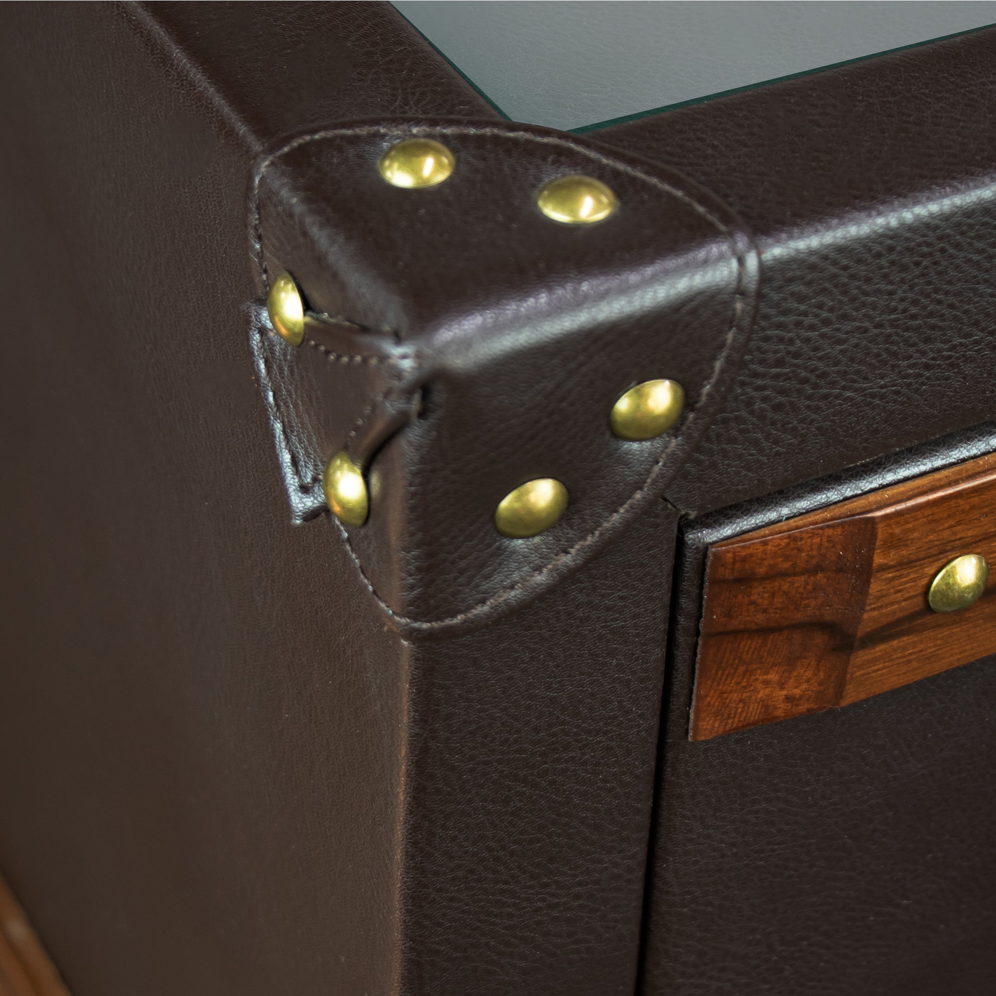 Genuine Leather, Genuine Leather, Fine wood base, suede fabric, metal stand & antique hardware.