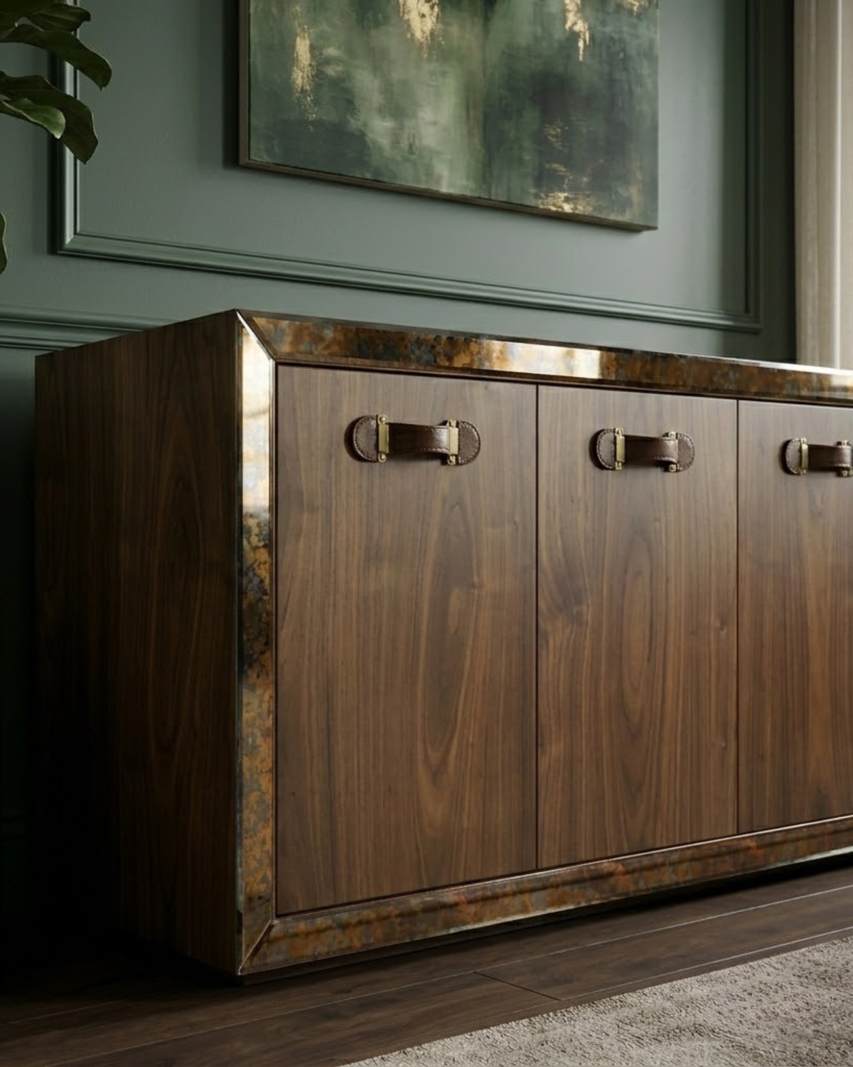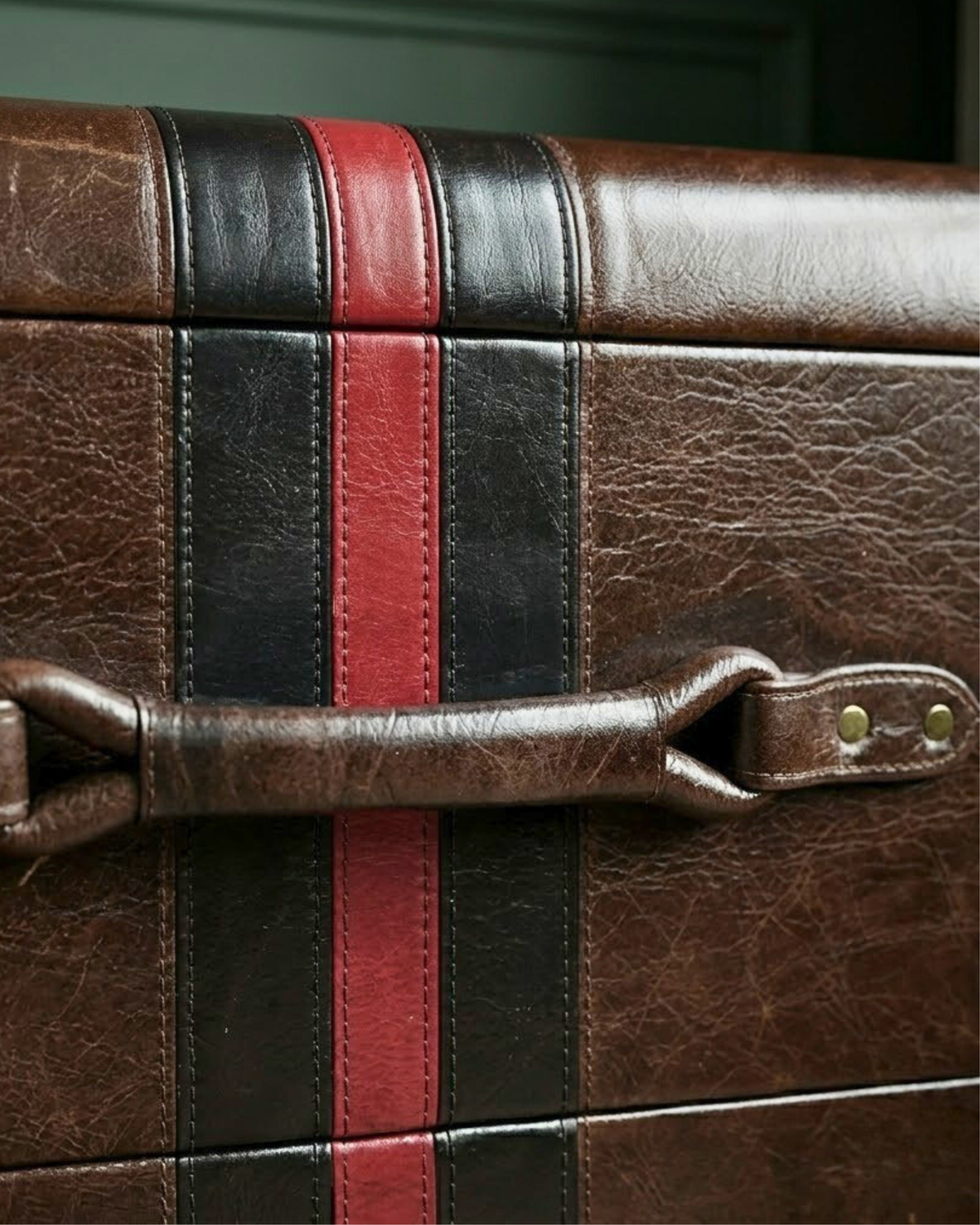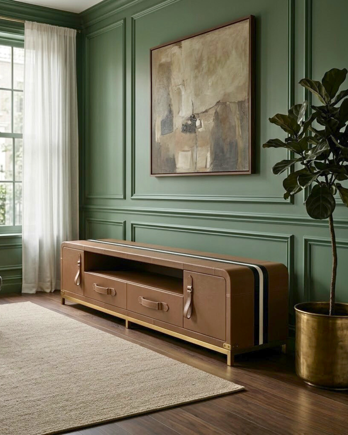 The collection is defined by a rich interplay of materials, cognac and espresso-toned leathers, deep walnut and mahogany finishes, and accents of antiqued brass. Leather is treated as more than upholstery; it wraps, frames, and defines surfaces, with visible stitching adding a layer of precision and craft. The wood carries a natural depth, polished yet not overly refined, allowing its grain to remain expressive. Brass hardware, corner details, handles, and fittings, introduces contrast while reinforcing the collection’s structured character. Subtle elements like the signature racing stripe add a sharp, unexpected rhythm to the otherwise restrained palette. The overall finish is warm, layered, and intentional, designed to age gracefully and gain character with time.