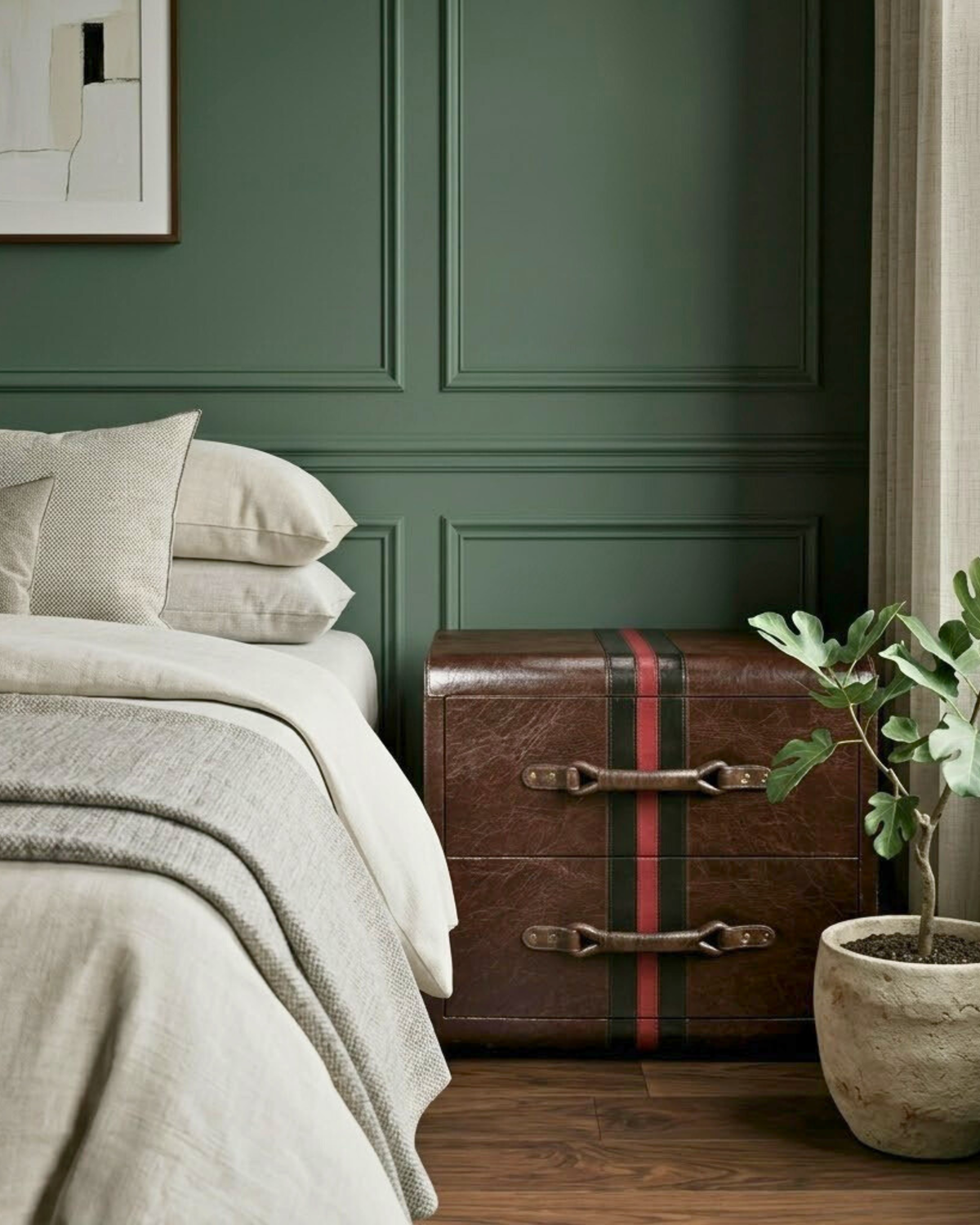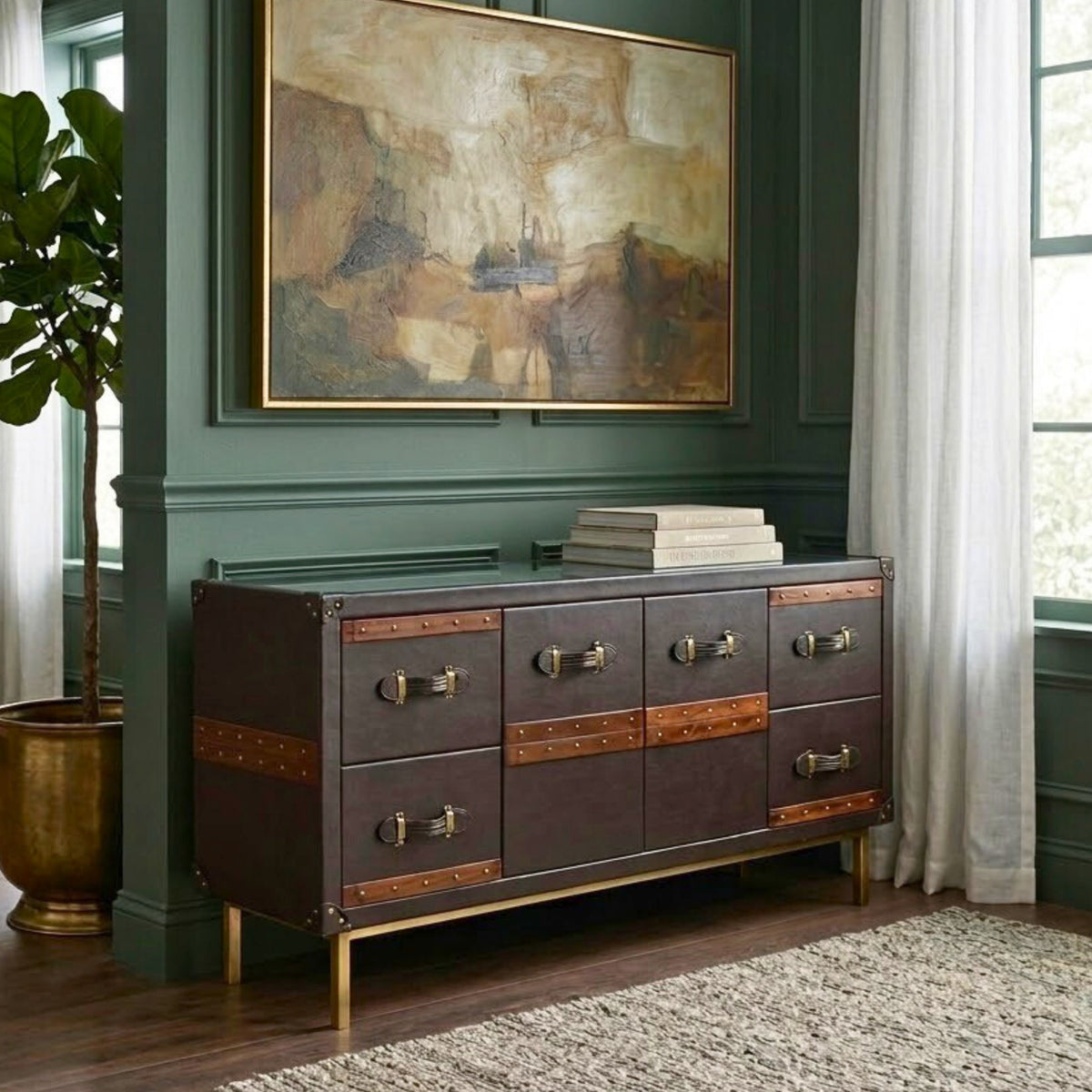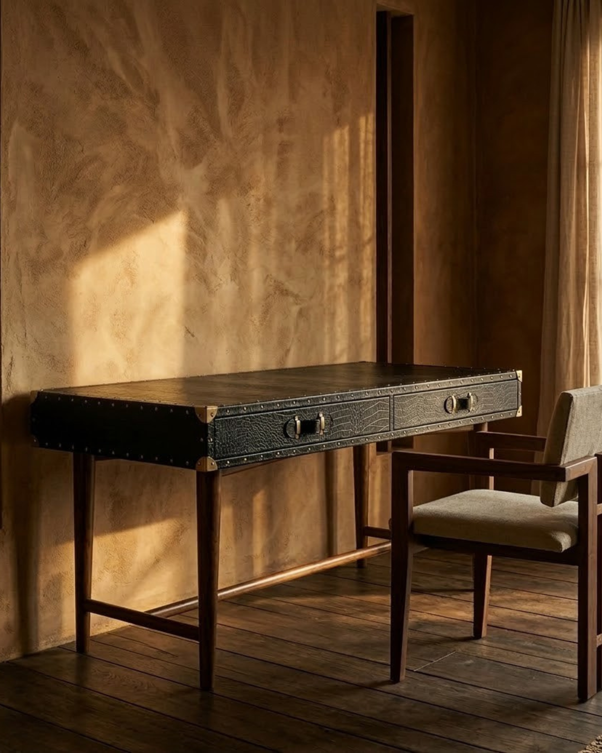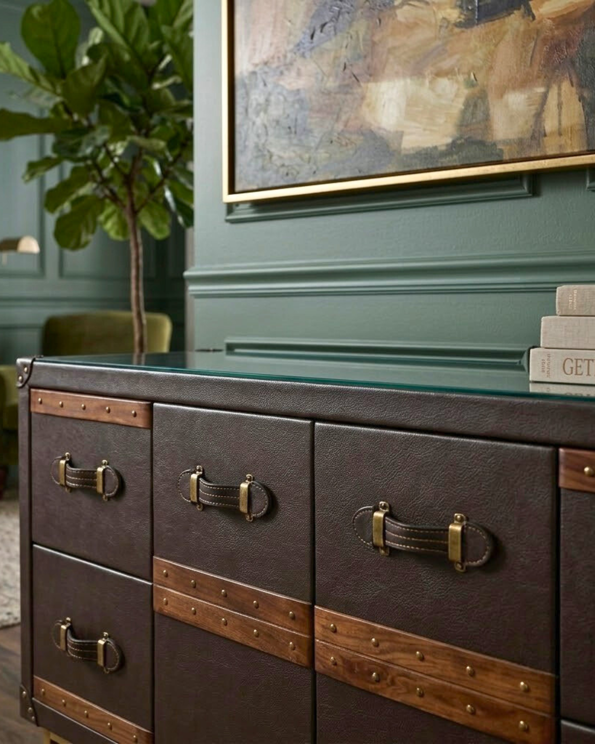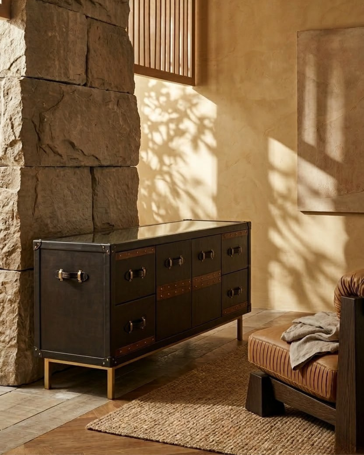 Travel-inspired campaign furniture with rich leather, brass, and timeless elegance.