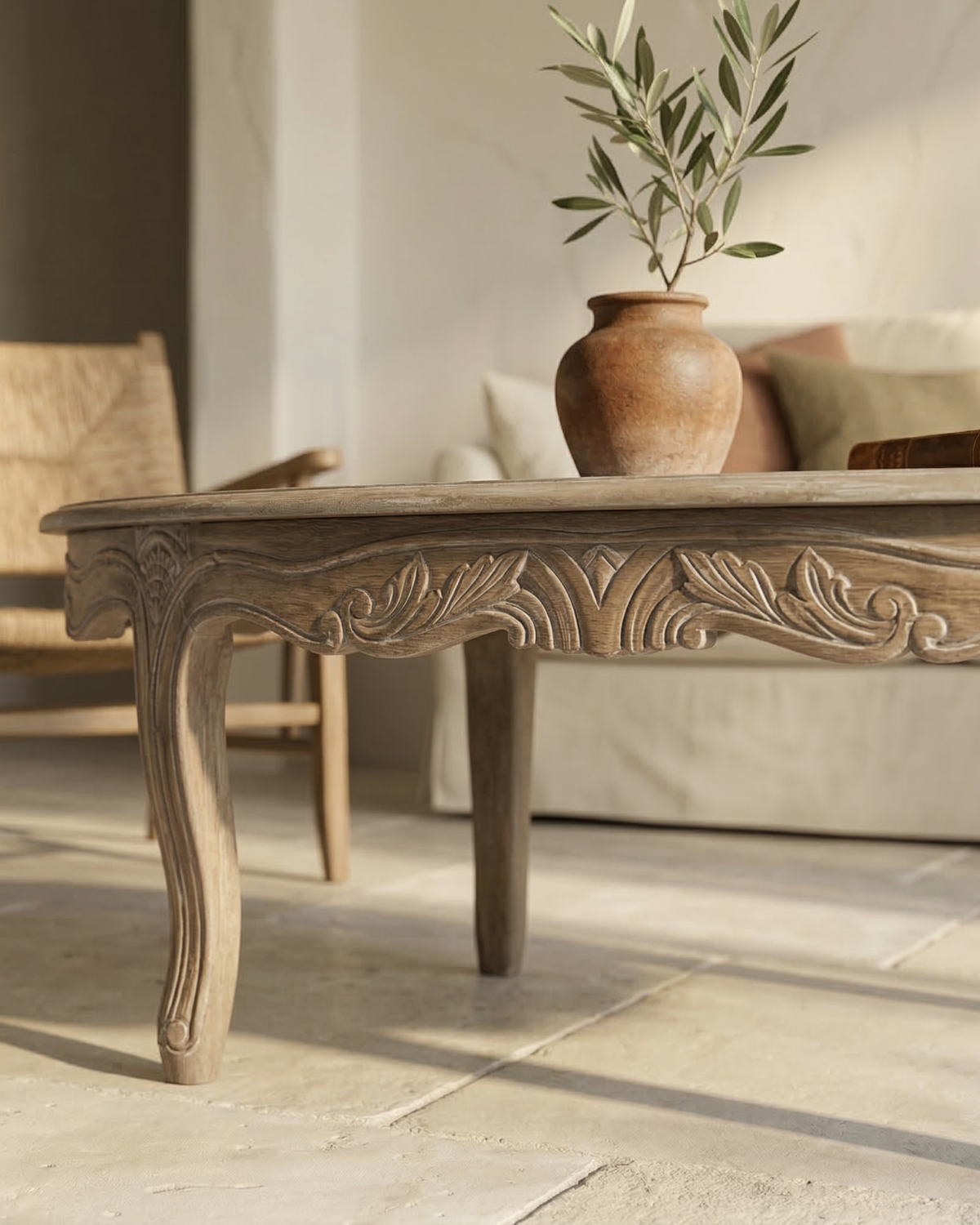 Refined French sculptural forms in limed oak with sun-bleached elegance.