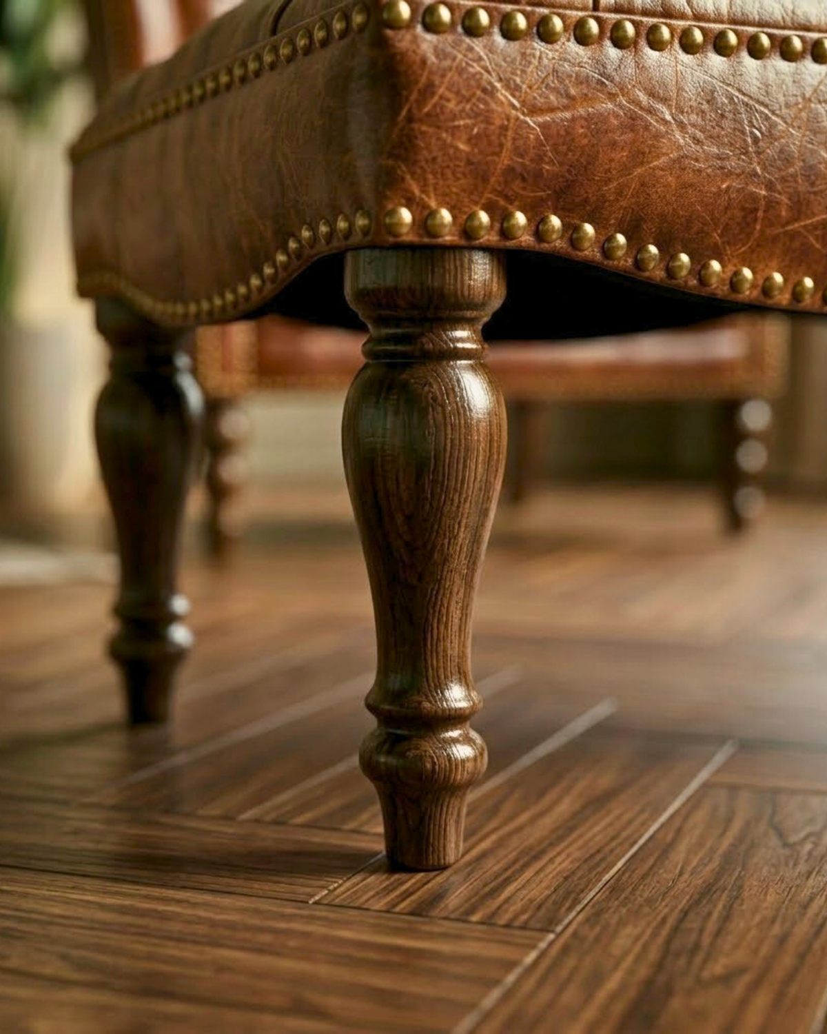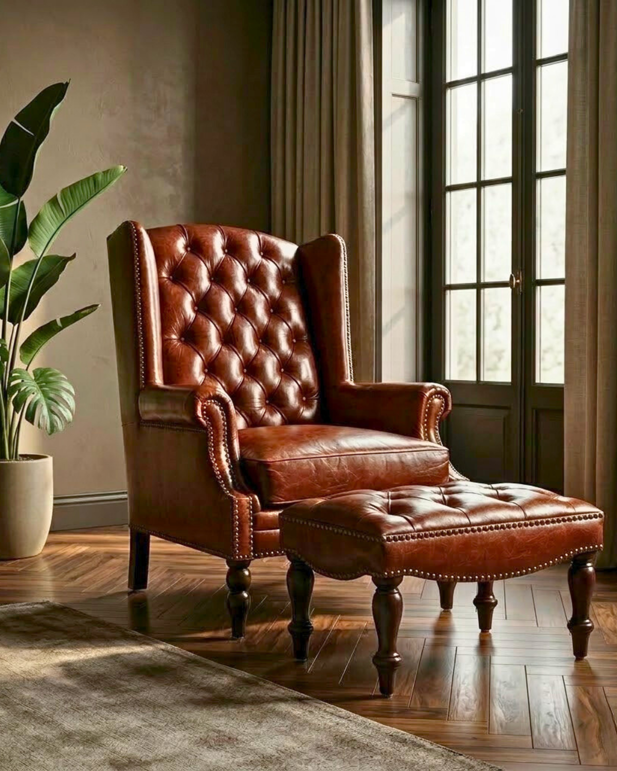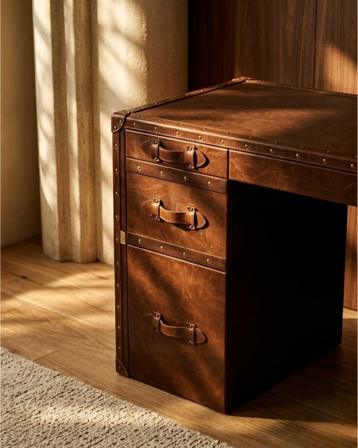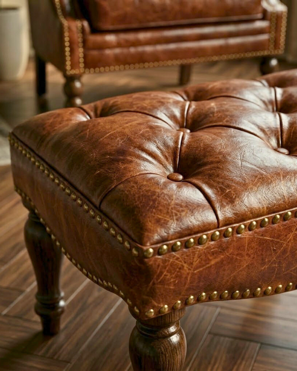 Equestrian-inspired heritage furniture with rich leather, brass, and timeless presence.
