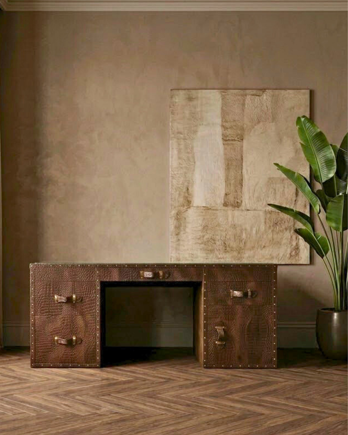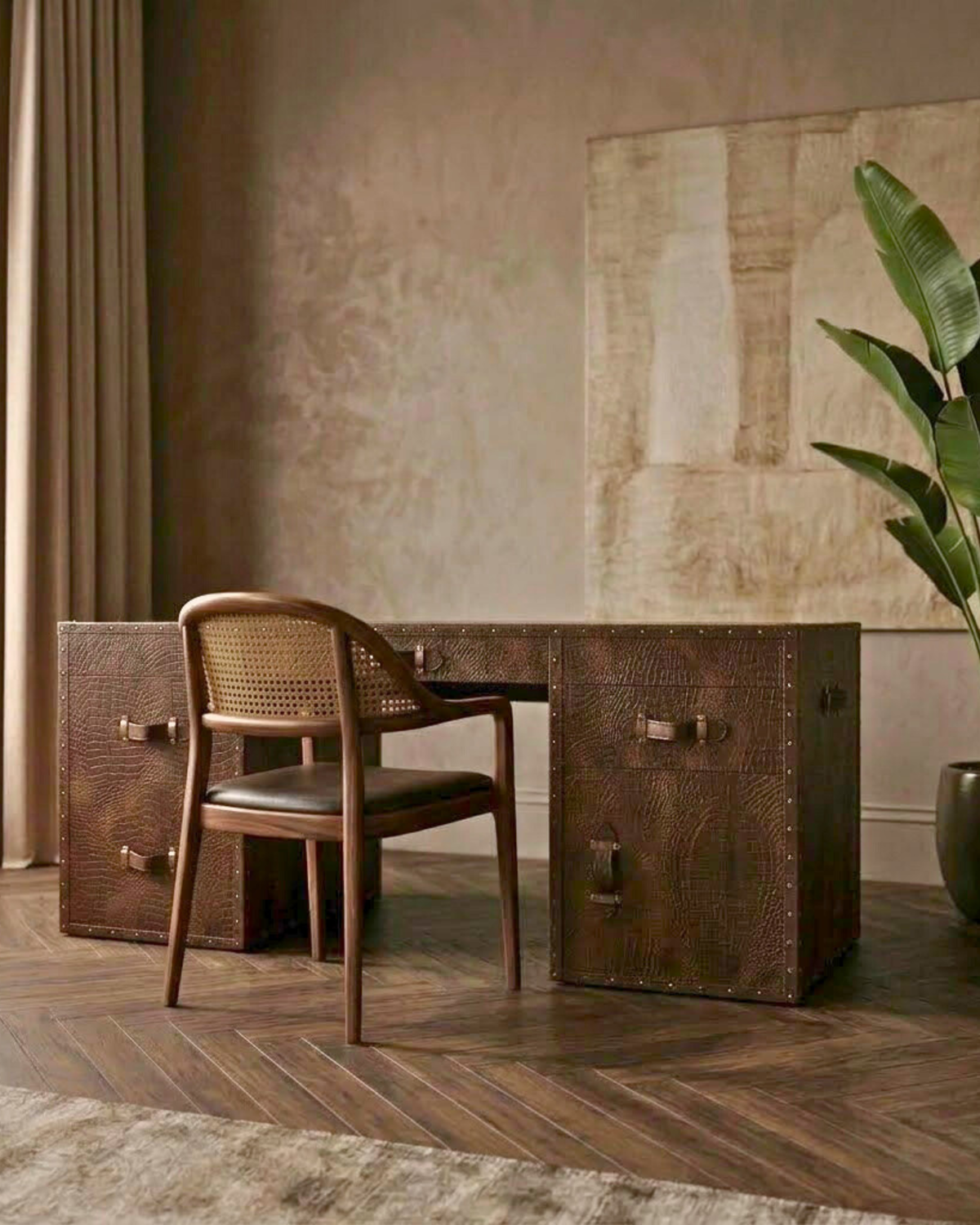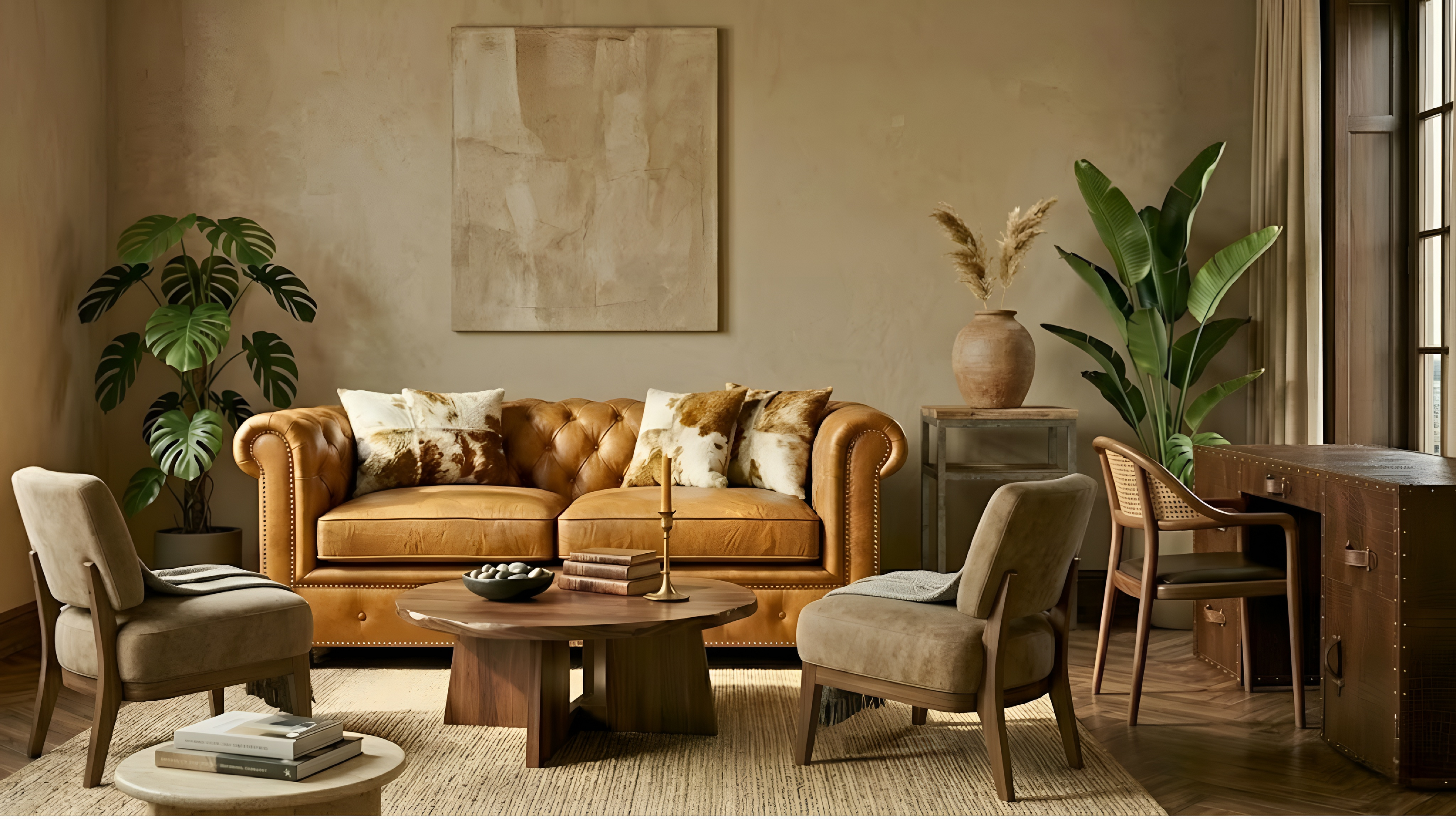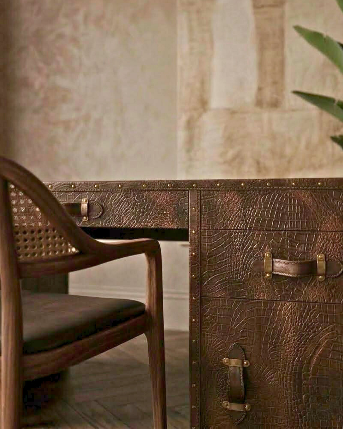 Equestrian-inspired heritage furniture with rich leather, brass, and timeless presence.